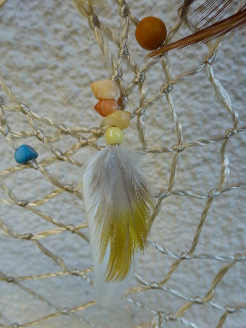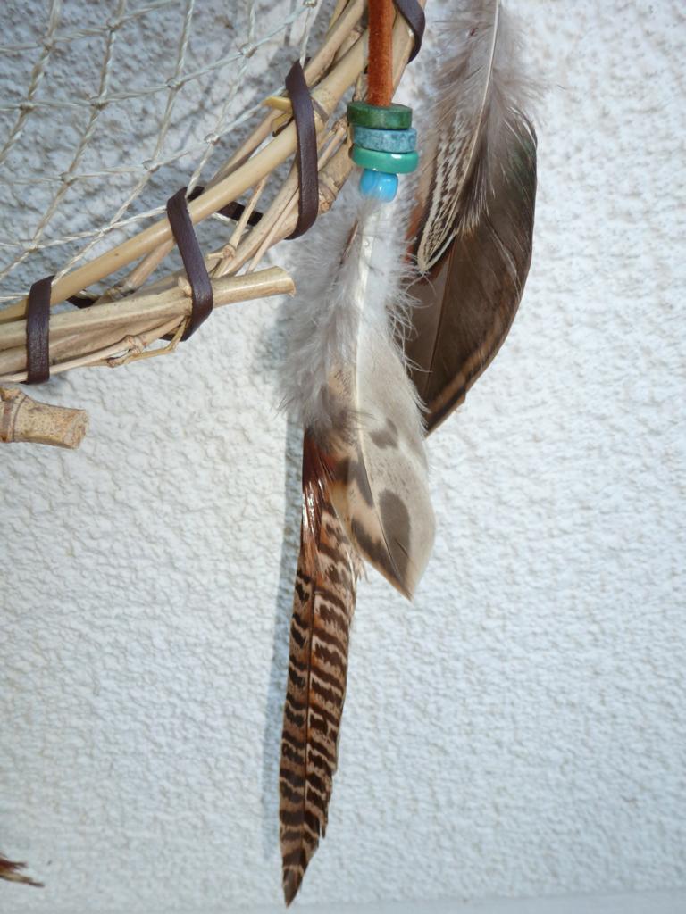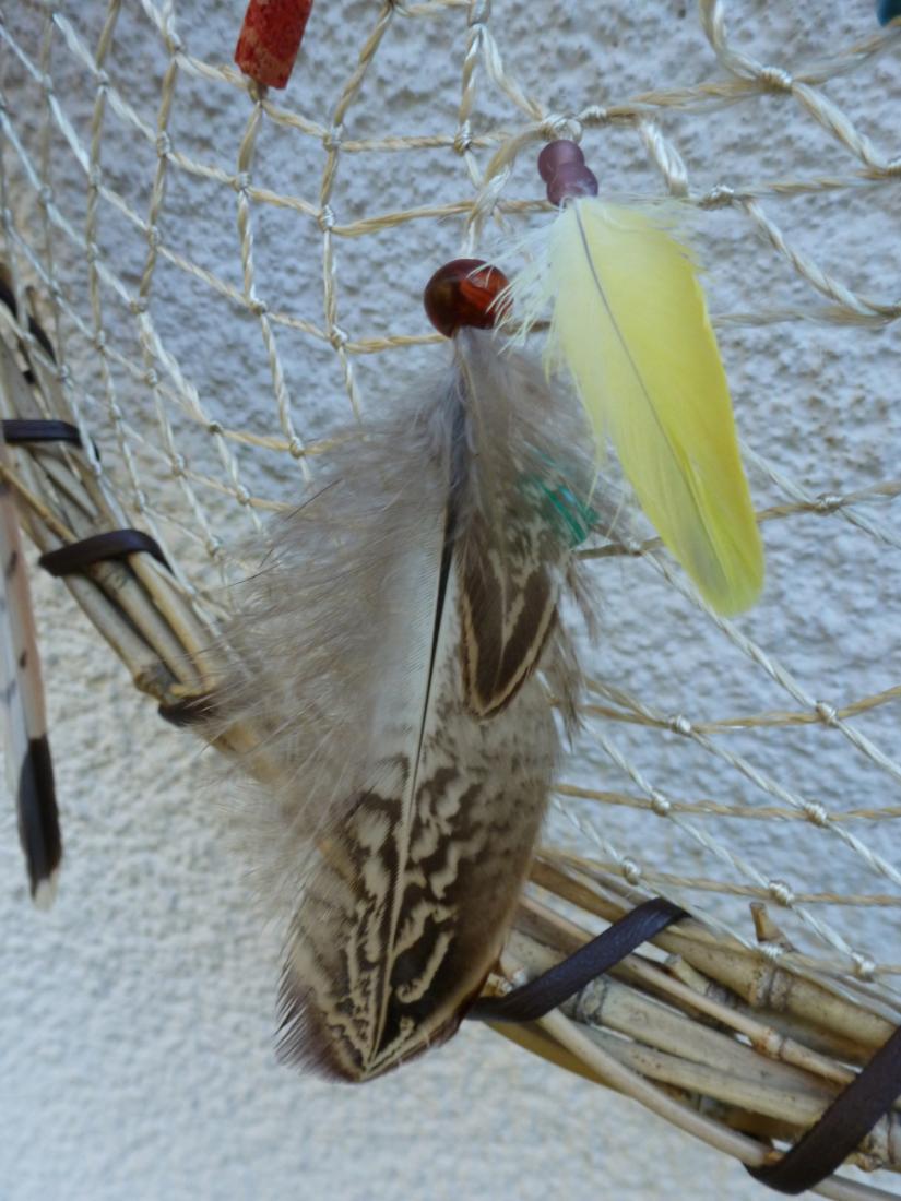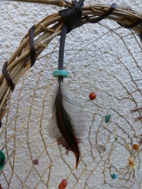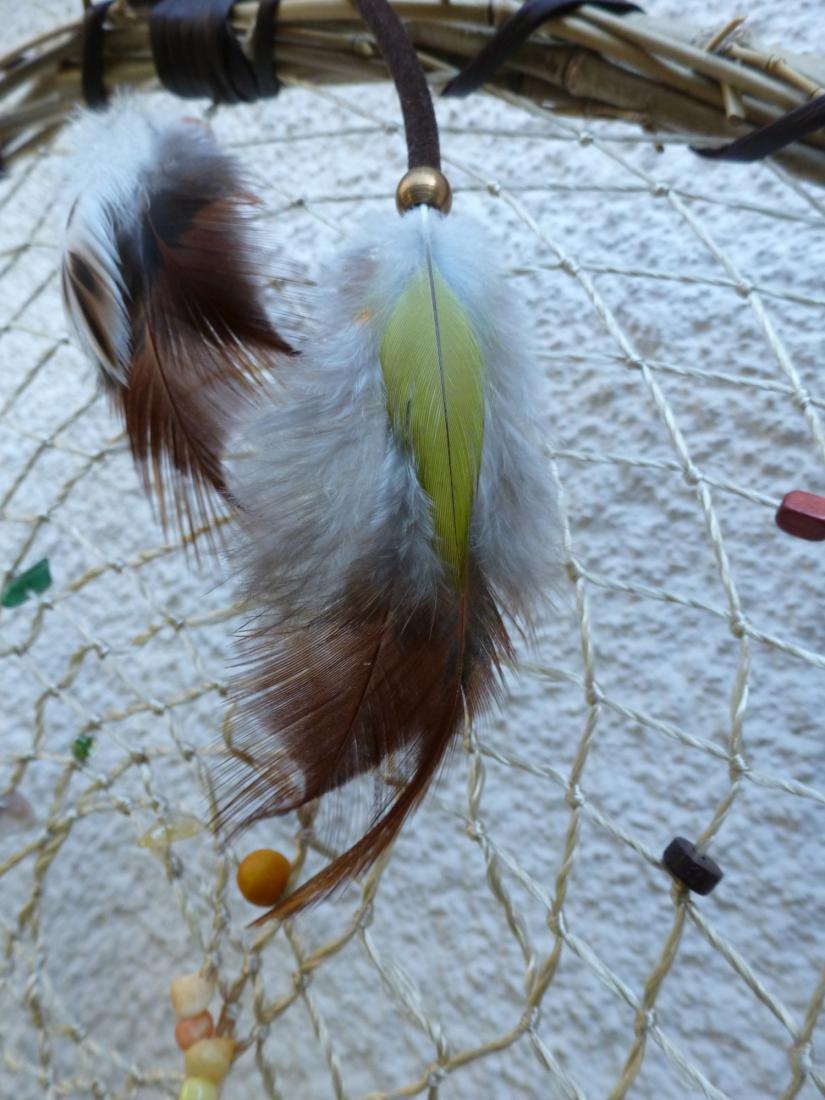Attrapeur de rêves en matières naturelles, fait à la main, modèle unique le tour est en bambou tissé d'une toile en soie, décoré de perles en pierres semi-précieuses, verre, bois & de plumes de faisan, canari et perruche. Diamètre 30 cm.