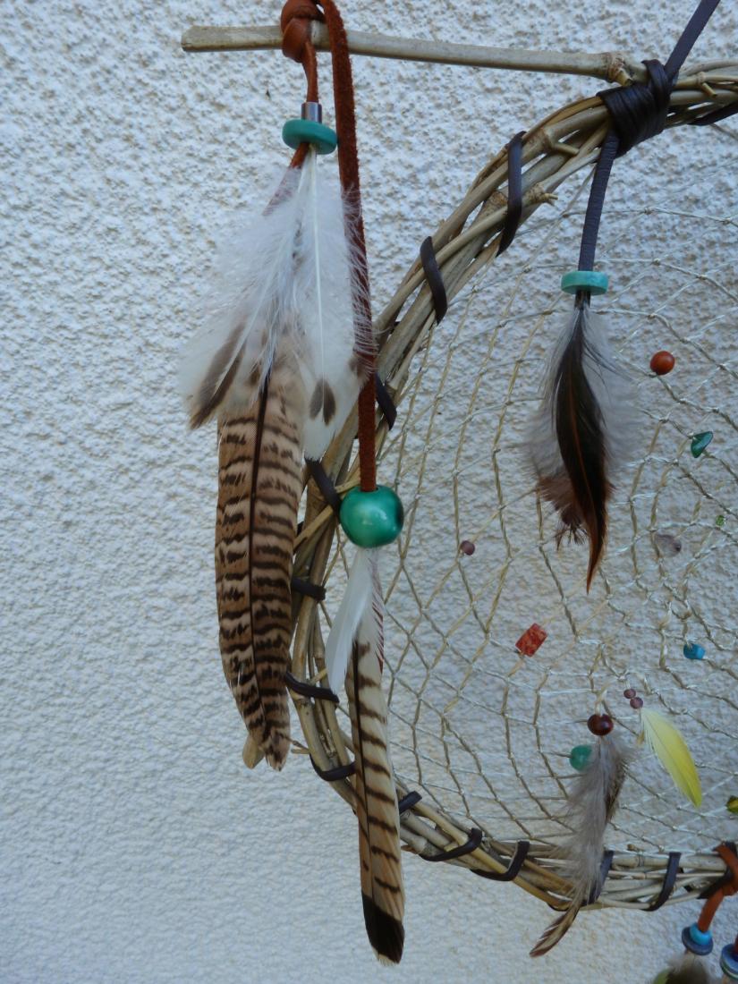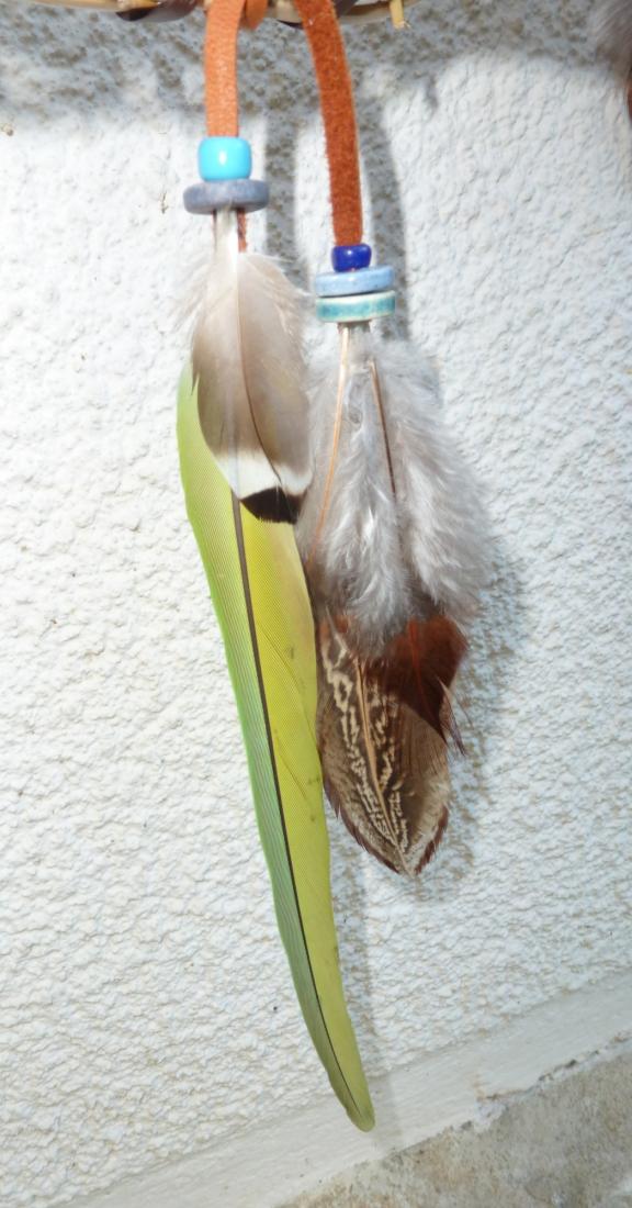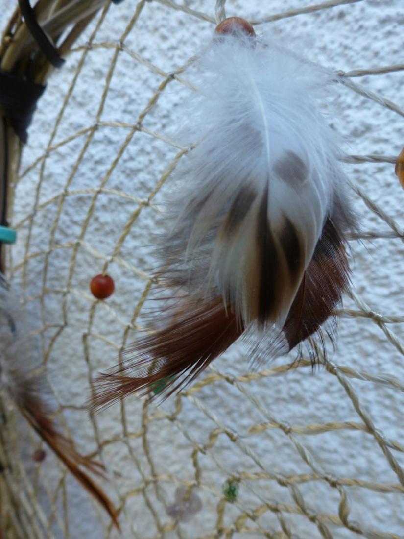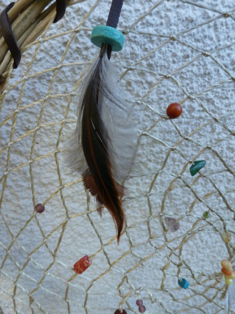 Attrapeur de rêves en matières naturelles, fait à la main, modèle unique le tour est en bambou tissé d'une toile en soie, décoré de perles en pierres semi-précieuses, verre, bois & de plumes de faisan, canari et perruche. Diamètre 30 cm.