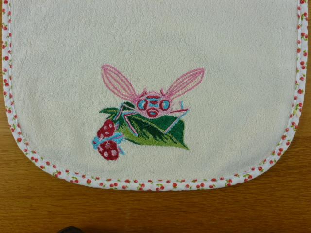 Bavoir en micro éponge de coton bio, double face en éponge, broderie machine, d'après un dessin créé dans mon atelier. Fermeture par un velcro.
